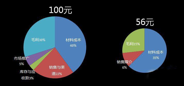 每个厂家的成本结构都不一样,图上是一个虚拟的成本结构,100元的产品卖到客户手中,材料成本40%,销售与渠道的成本占去22%,库存与应收款3%,市场推广费用占5%,毛利占30%,去除生产研发管理,蕞后纯利余10%。为何可以变为56元?材料成本35%,这没少多少,便宜绝不能靠偷工减料,只能靠海量降低5%。材料成本少得不多,一定要保证质量,但是,销售与渠道的成本占去22%,库存与应收款3%,市场推广费用占5%,这些都没有了,全部变为销售媒介的6%,毛利占15%,由于是单品,海量生产,管理成本、研发费用极低,所以剩下的利润也是10%左右。这是一个可持续的方法。核心是把这些不必要的成本都还给客户,所以互联网的颠覆首先是成本结构的颠覆。